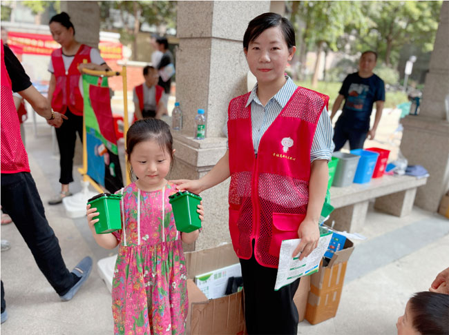 首先,黨員志愿者向社區(qū)的小朋友們介紹了垃圾四分類(lèi)的標(biāo)識(shí)及顏色,并通過(guò)生動(dòng)直觀(guān)的講解讓大家認(rèn)識(shí)到垃圾正確分類(lèi)的重要性。志愿者們利用“分類(lèi)垃圾桶”引導(dǎo)小朋友認(rèn)識(shí)“可回收物”、“其他垃圾”、“有害垃圾”、“廚余垃圾”四種分類(lèi)垃圾桶,志愿者還就日常家庭生活中產(chǎn)生的垃圾,細(xì)致地講解如何將其分類(lèi),倡導(dǎo)大家做好生活垃圾分類(lèi),實(shí)現(xiàn)資源再利用。
