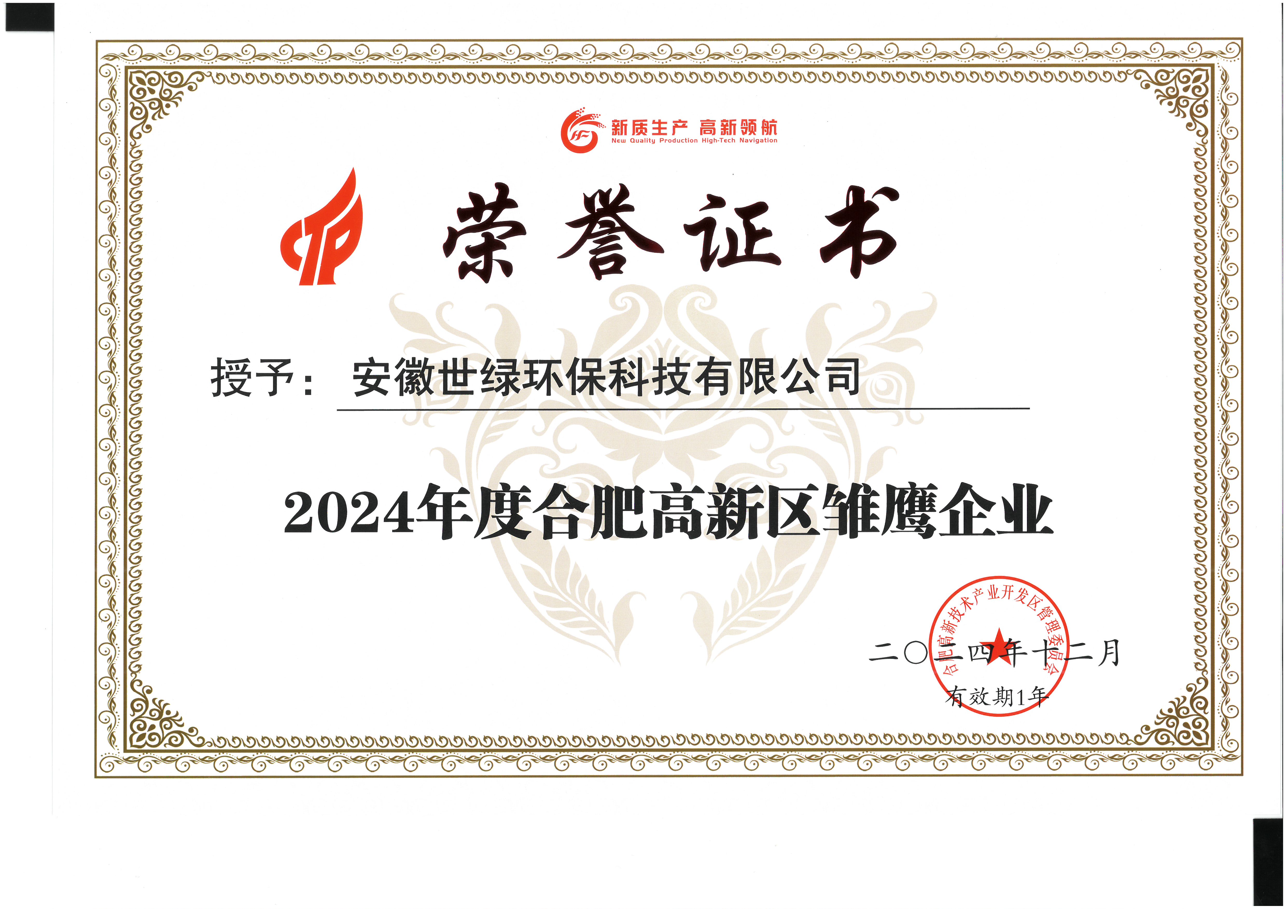 2024年的尾聲,安徽世綠環保科技有限公司憑借其卓越的創新能力和在環保領域的杰出貢獻,榮獲了“2024年合肥高新區新質生產力企業”的稱號。這一榮譽不僅是對世綠環保科技長期以來努力的肯定,更是對其在推動環保產業發展、促進生態文明建設方面所做貢獻的高度認可。